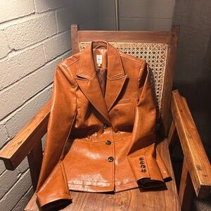 Sleek tan leather blazer by Maeve. Features classic lapel and button closure. Perfect for a polished look. New without tags, unworn. Size XXS.