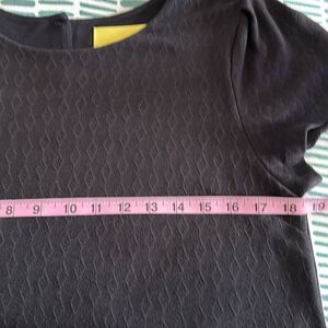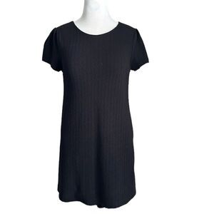 Textured cotton blend swing dress with short/cap sleeves. Length is 34”. Color - Black.