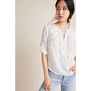Maeve Anthropologie Women's Marva Lace-Up Linen Tunic Top White Size 0 (XS) Boho