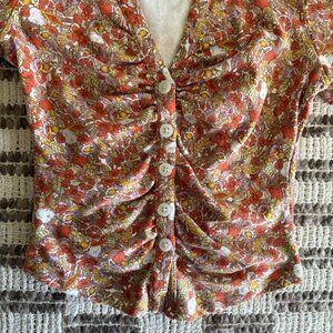 Maeve Anthropologie Womens Ruched Citrus Fruit Button Up Top Size S Orange Artsy