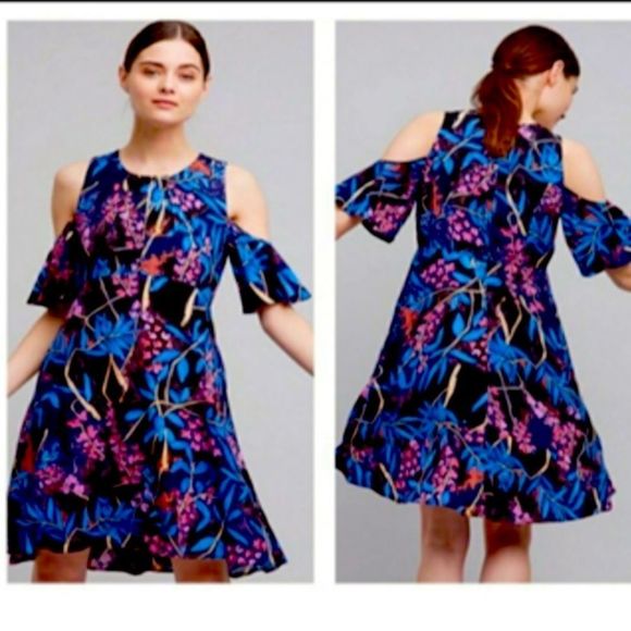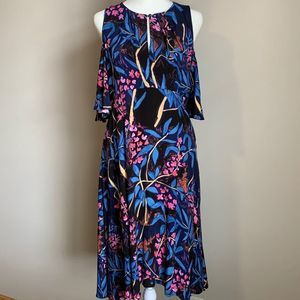 Maeve Anthropologie Dress Womens Size 4 Open Cold Shoulder Fit & Flare Blue Pink Black Floral Wedding Guest