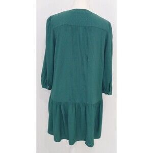 This Maeve dress is perfect for any occasion, from weddings to workwear. The dress features a drop waist design with pleated accents, ruffles, buttons, and quilting. The 3/4 sleeve length and V-neckline green color and knee-length design make it a perfect choice for summer and spring. This dress is preloved and in good condition. Refer to photos for measurements.