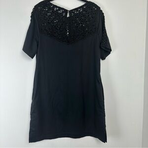 This is a Maeve Anthropology Linen Blend Dress in size Medium. It features a solid black color with a woven fabric type and a button closure. The dress has short sleeves, a round neck, and falls to a short length. It is designed in an A-line style with crochet accents and button details. Perfect for various occasions like travel, parties, or casual outings, this versatile dress is a wardrobe essential for a bohemian or classic look.