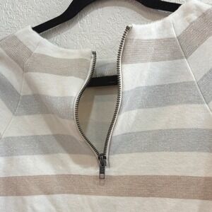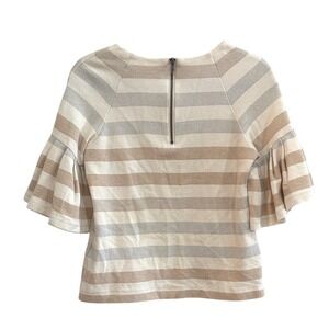 Keywords: striped top, bell sleeve top, beige blouse, gray blouse, neutral top, womens blouse, casual top, fashion top, cotton blend top, statement sleeves, boho top, modern blouse, dressy casual, striped blouse, womens fashion