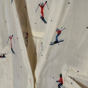 Lightweight, quality material with a fun ski design. Modified dolphin-style hem and button front with pockets. Slightly sheer. Runs slightly big.