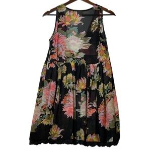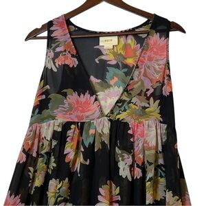 This relaxed tunic by Maeve showcases an asymmetrical design with a striking black and pink floral pattern. The sleeveless top offers a flowing silhouette, perfect for a breezy, comfortable fit. Ideal for casual outings or layering, this piece combines elegance with a touch of whimsy.