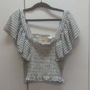 Stylish Maeve blouse with a checkered pattern. Features ruffled sleeves for a feminine touch. Perfect for versatile styling.