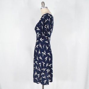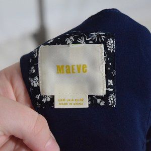 Super cute little retro-style mini dress from Anthropologie brand, Maeve. Navy blue with a bright white abstract floral pattern on a soft and silky viscose crepe fabric, very lightweight and flowy. Deep, sweetheart neckline, fitted in the bust and waist with a flared skirt. Size 0. Length from shoulder: 36" Bust: 32" Waist: 26" *measurements taken with garment lying flat; without stretching.