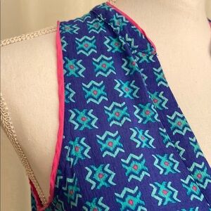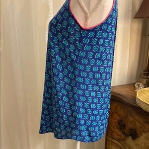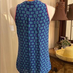 This sleeveless tank top offers a relaxed fit with a flowing A-line silhouette, perfect for casual outings. The blue fabric is enhanced with a subtle geometric or floral print, adding a touch of sophistication to its lightweight design. Ideal for warm weather, it features a clean V-neckline and simple hemmed armholes.