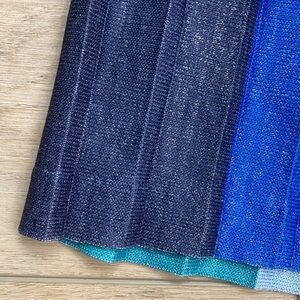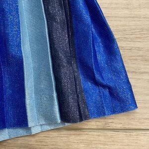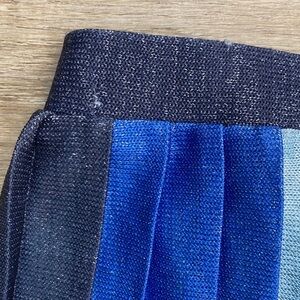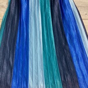 Chic midi skirt with bold blue and green stripes. Elegant pleated design.