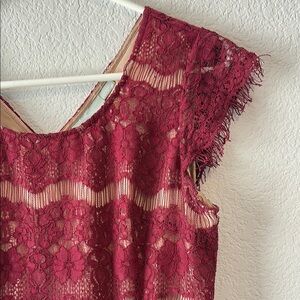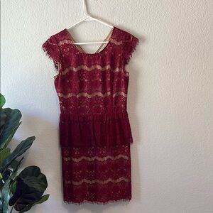 Elegant burgundy lace dress with cap sleeves and nude lining. Perfect for evening wear. Peplum waist skirt. Anthropologie brand Maeve size small.