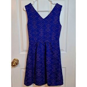 This Maeve By Anthropologie Blue and Purple Aztec Jacquard A Line Mini Dress is in excellent used condition. This aztec patterned chic mini dress is sleeveless with a v neckline. This fit and flare dress is colorful and fully lined and perfect for a party or everyday casual wear.
