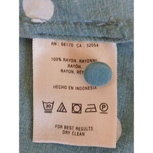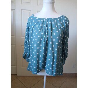 The Maeve Braxton Polka Dot Flutter Sleeve Blouse in size small is a stylish and versatile top perfect for various occasions. Made from lightweight 100% rayon fabric, this blouse features a flattering boat neckline, 3/4 dolman sleeves, and a pullover closure. The teal and white polka dot pattern adds a touch of colorful charm, while the classic fit and breathable design make it suitable for all seasons. Ideal for workwear, casual outings, or travel, this blouse from Anthropologie's Maeve brand is a timeless addition to any woman's wardrobe.