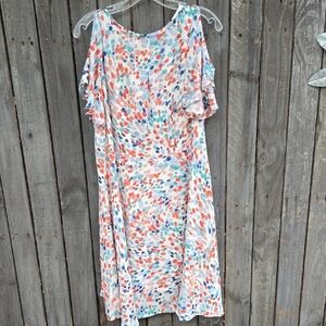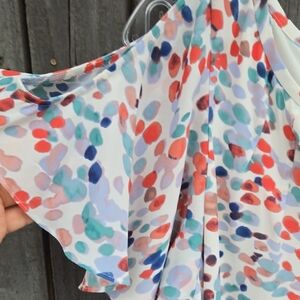 Chic cold shoulder style. Floral pattern with soft hues. Ideal for warm days.
