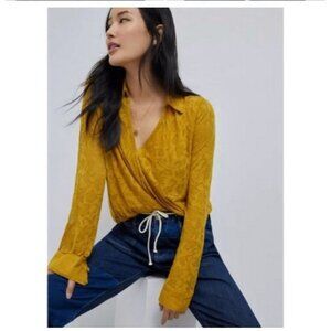 Maeve By Anthropologie Lydia Floral Semi Sheer Mustard Yellow Wrap Top Size XS