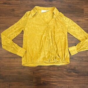 This Maeve by Anthropologie wrap top features a charming floral design in a vibrant mustard yellow. The semi-sheer fabric and wrap style provide an elegant, feminine look, perfect for any occasion.