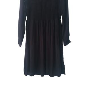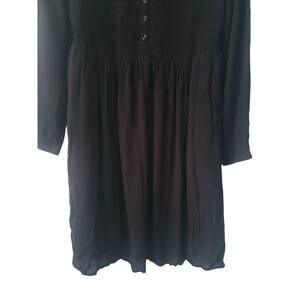 Style: Black, long sleeve, a-line dress. V neckline. Mid length. Elastic waist. Henley button front. Smocked bodice. Hidden side seam pockets. Lined. 100% viscose.