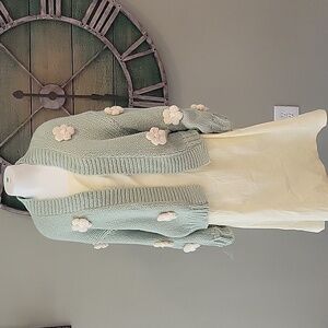 Stylish mint cardigan featuring cream floral embellishments. Ideal for layering. Relaxed fit open front used Cozy Layer Cabin Beach night whimsical coquette twee