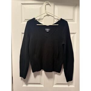 The sweater features a V-neck and a fitted silhouette with subtle detailing, such as piping down the arms and pleats at the bottom. This is a very versatile piece.