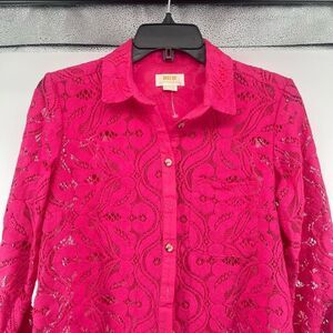 Maeve By Anthropologie Women’s Pink Open Lace Slim Button Down Blouse Top Size 4