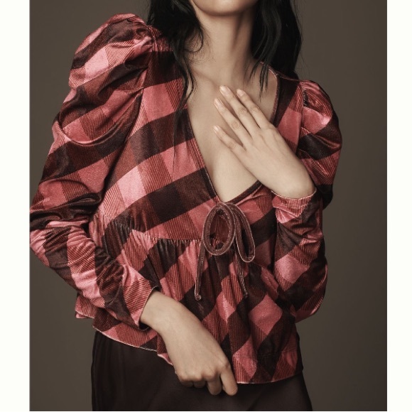 Maeve Checkered Puff Sleeve Velvet Blouse in Pink and Brown