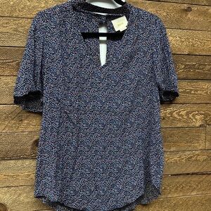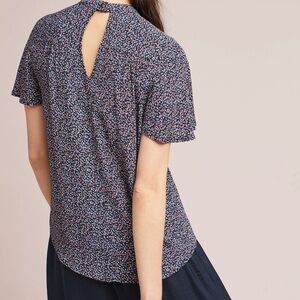 Chic and feminine blouse by Maeve, featuring a choker neckline with keyhole detail and flutter sleeves. The micro floral print in a blue motif adds a delicate pop of color, perfect for dressing up or down. Lightweight fabric with a relaxed fit.