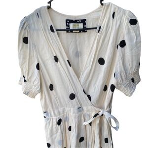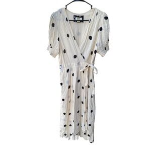 Elegant wrap midi dress with bold polka dots. Features short sleeves and a flattering silhouette.