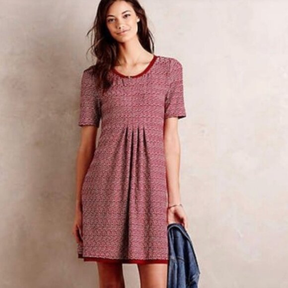 EUC Maeve from Anthropologie Dora Short Sleeve Cranberry Red and White Pleated Front Dress
