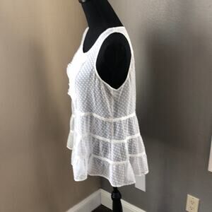 This elegant white sleeveless top is perfect for any occasion. Its delicate design adds a touch of sophistication to your wardrobe. Perfect over a cami. 23” neck-to-hem. From a smoke-free home.