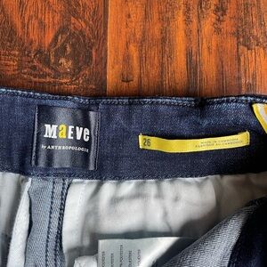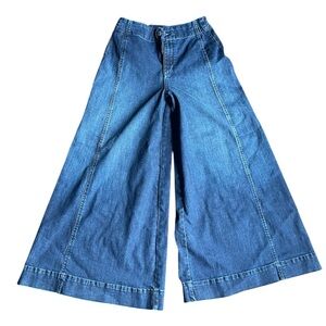 Preowned. Great condition. These Maeve jeans feature a dramatic flare and wide-leg design, offering a flowing silhouette in a classic medium blue denim. The high-waisted style ensures a comfortable and flattering fit, perfect for a casual yet chic look. Crafted from traditional denim, these jeans exude a timeless appeal with their subtle worn-in finish.