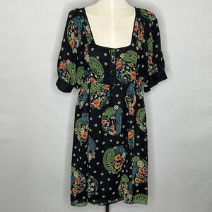 Maeve Floral Silk & Taffeta Tie Back Square Neckline Dress - Size 4. Fair pre-owned condition. There are some pulls in the silk, mainly on the left shoulder area, shown in pic. A few smaller ones throughout. Because the print is so busy, they don't show much. The buttons could use some reinforcing. Priced accordingly. Outer layer is 100% silk, liner is taffeta, 5 button closure at bodice with small inner snap at corner to prevent pulling, square neckline, empire waist with sash ties that pull to the back, short balloon sleeves, lace at lining hemline. Approximate measurements: 16" bust, 36" length.