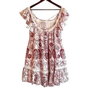 Maeve Flutter-Sleeve Babydoll Mini Dress Size Medium Red White Lace Floral