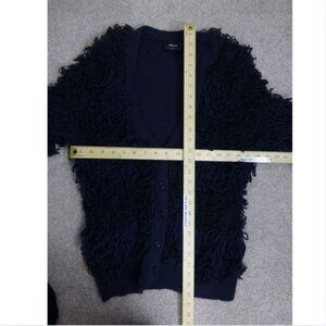 Description: Pre-owned and still in great condition. Deep V-neckline. Button-up closure at front. Heavy yarn detail across the entire sweater for a fringe look.