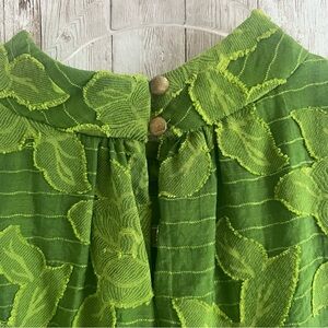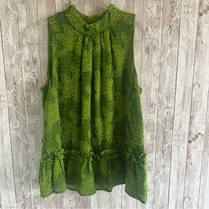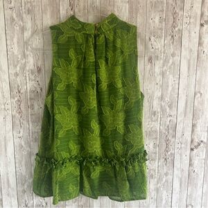 This Maeve blouse in a vibrant green hue features a sleeveless design with a stylish mandarin collar. The pleated and ruffled details add a touch of elegance, while the lightweight fabric ensures a comfortable and airy fit. So pretty for work or a nice dinner out. Size 6