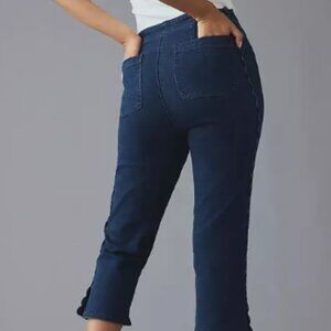 New with tags, Maeve High-Rise Pedal Pusher Jeans by Anthropologie. Cropped in a solid dark rinse wash with feminine scallop detailing along the sides. 97% cotton, 2% polyester, and 1% elastane. Front welt pocket and back patch pockets. Zip front. Fit: 11.25" rise, 22" inseam, and 7" leg opening.