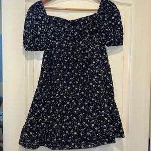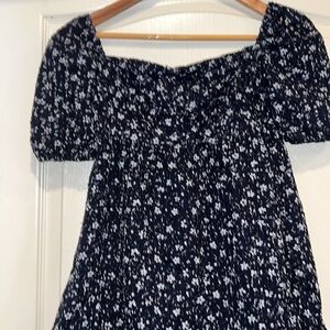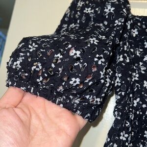 Maeve by Anthropologie dress, eyelet black & white floral textured patter, lined body but not sleeves, gathered puff sleeve detail, babydoll style, lined bodice.