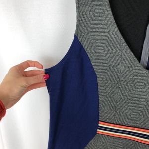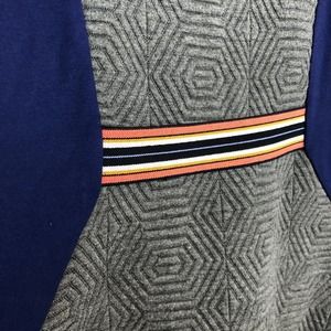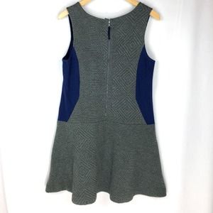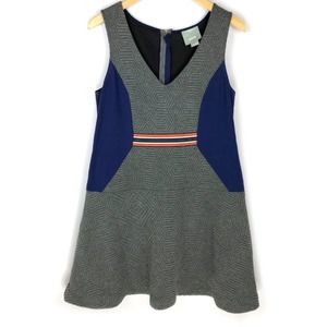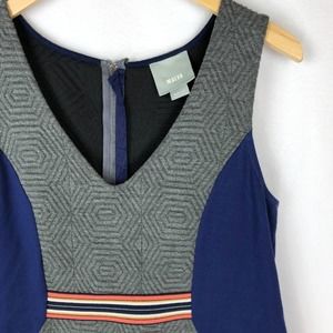 The Ludlow dress by Anthropologie brand Maeve. Medium gray with an all over geometric quilted pattern, with smooth blue side panels and a multicolored striped elastic band across the front of the waist. Exposed back zipper. Sleeveless. A-line / trapeze silhouette with a seam below the side panels that creates a subtle drop waist. Deep V neck. About knee length.