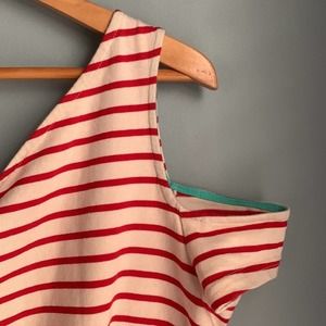 Super cute dress by Maeve. Anthropologie brand. One shoulder red and off white striped shirt dress. I would wear this as a beach coverup, cocktails with the girls, date night or warm summer night on your patio.