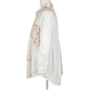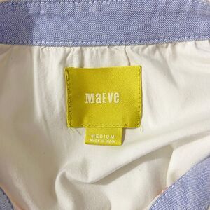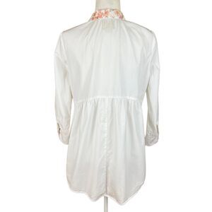 Maeve Mavis Patchwork Button-up Top Size M White Pink Cotton 3/4 Sleeves Pockets. Shirt is in good preowned condition. Lightweight cotton poplin in white, with pink and peach floral and paisley patchwork. Rounded collar. Button-front with mismatched buttons. 3/4 sleeves with button cuffs. Side seam pockets. Curved hemline.