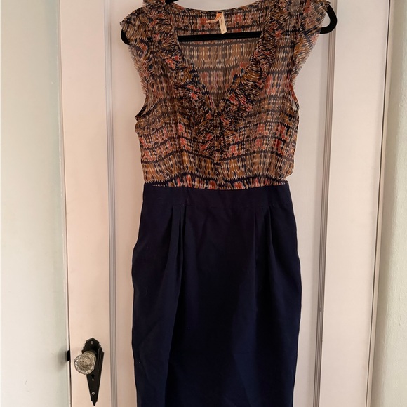 Chic mini dress with ruffle details perfect for work. Multicolor top with a solid navy skirt. Perfect for versatile styling. Top of dress is sheer and bottom is fully lined. Only worn once.