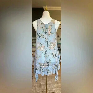 This flowy top by Maeve features a multicolored floral print on a soft, pale blue background with a V-neckline and sleeveless design.