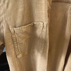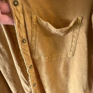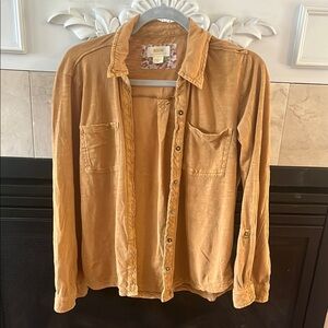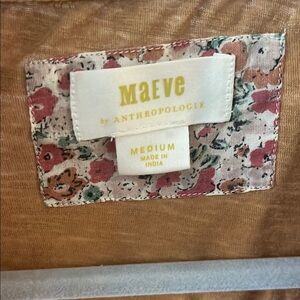 Maeve mustard color Button down shirt . Sleeved can be button to 3/4 as shown . Can be worn closed or open . It does have a teeny tiny hole on the left shoulder seen in last 2 pictures probably from a tag being removed . Not really noticeable at all .