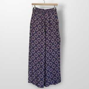 Wide leg, palazzo style pants in a purple & orange print with smocked elastic waistband and pleats below waistband by Maeve for Anthropologie. Has pockets. Opens with invisible zipper at center back. 100% viscose.