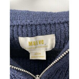 The Maeve Navy Blue Sweater is a stylish and classic piece perfect for a nautical or preppy look. This turtleneck sweater in size medium features a chunky-knit design with cap sleeves, making it ideal for travel or casual occasions.