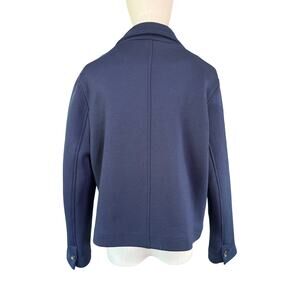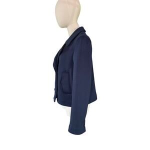Timeless and tailored, this Maeve by Anthropologie navy blue double-breasted jacket is a modern twist on the classic peacoat. Crafted from a soft, mid-weight knit with gentle stretch, it drapes beautifully while holding its structured silhouette. The jacket features a notched lapel collar, flap front pockets, and polished button details. Perfect for layering over dresses, trousers, or denim — a polished essential for year-round wear.
