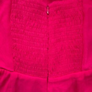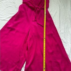 This Maeve jumpsuit in a vibrant pink hue features a strapless top and a wide-leg silhouette, offering a blend of elegance and modern style. The lightweight, flowy fabric creates graceful movement, while the fitted waist adds a flattering contrast. Perfect for formal occasions, this jumpsuit is a statement piece with its striking color and sophisticated cut.