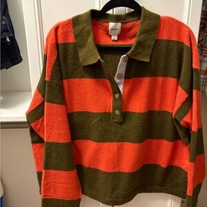 Orange and army green stripe with lilac/purple strip where button are. Size large
