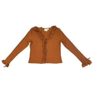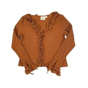 Chic rust blouse with ruffle details. Long sleeves with tie accents. Perfect for casual or dressy occasions.