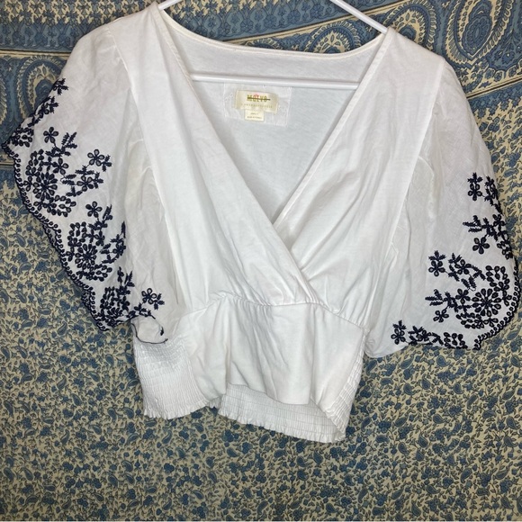 Maeve / Anthropologie Tavi beautiful embroidered cap sleeve blouse. Cropped, gathered at the waist. Size small. Cotton. No flaws