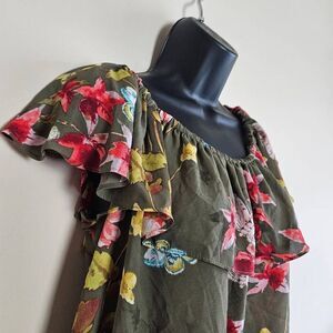 The Maeve Vallita blouse is an off-the-shoulder top with a loose and flowy design. It features a ruffled neckline that rests just below the shoulders, adding a feminine touch. The fabric has an olive green base with a vibrant floral print, incorporating colors like red, pink, yellow, and blue. The print is bold yet delicate, with large flowers and scattered throughout. Paired with jeans, it gives off a casual yet stylish look suitable for warm weather or spring occasions. Maeve is an Anthropologie brand.